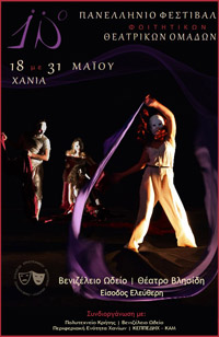 Το 10ο Πανελλήνιο Φεστιβάλ Φοιτητικών Θεατρικών Ομάδων "ταξιδεύει" στα Χανιά. Για 14 μέρες στα Χανιά θα ταξιδέψουν 10 φοιτητικές θεατρικές ομάδες από όλη την Ελλάδα με σκοπό την παρουσίαση του "μόχθου" τους, την ανταλλαγή ιδεών και απόψεων για το θέατρο, την πολιτιστική ενδυνάμωση τόσο των επαρχιακών πόλεων όσο και των αστικών κέντρων και φυσικά για να περάσουν καλά.