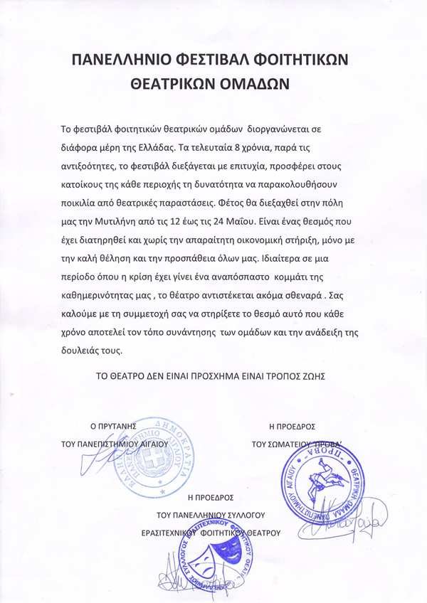 Το 8ο Πανελλήνιο Φεστιβάλ Φοιτητικών Θεατρικών Ομάδων πραγματοποιείται από την Πανελλήνια Ένωση Ερασιτεχνικών Φοιτητικών Θεατρικών Ομάδων, υπό την αιγίδα του Πανεπιστημίου ΑΙγαίου και την ευγενική υποστήριξη του Δήμου Μυτιλήνης και των τοπικών θεατρικών ομάδων. Το συντονισμό κλήθηκε να αναλάβει η φοιτητική θεατρική ομάδα "Πρόβα". Το εγχείρημα αυτό αποτελεί το αποκορύφωμα των δραστηριοτήτων μιας ολόκληρης χρονιάς και αποτυπώνεται στη θεατρική σκηνή με στόχο την προαγωγή του πανεπιστημιακού ερασιτεχνικού θεάτρου, ως μέσο συμμετοχικής έκφρασης και δημιουργίας.